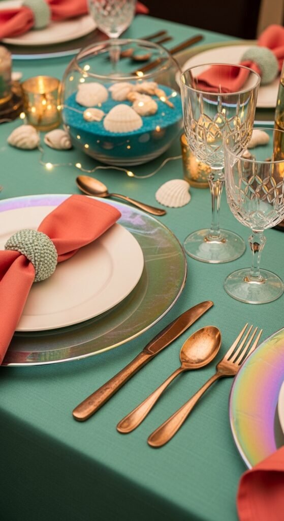 For refined tablescapes, layer seafoam linens with scattered pearls and coral-colored napkins. Your serene centerpieces should feature low glass bowls filled with blue sand, white shells, and battery-operated fairy lights for that bioluminescent glow.