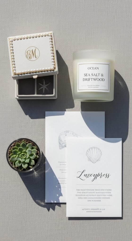 Unique mermaid themed stationery works beautifully too—think letterpress notecards with subtle shell motifs or refined journals with iridescent covers. Your guests will actually use these items.