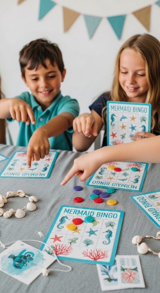Try these mermaid bingo variations: have kids act out each creature when called, or use ocean sound effects instead of verbal announcements. Winners earn small treasures like shell necklaces or temporary tattoos.