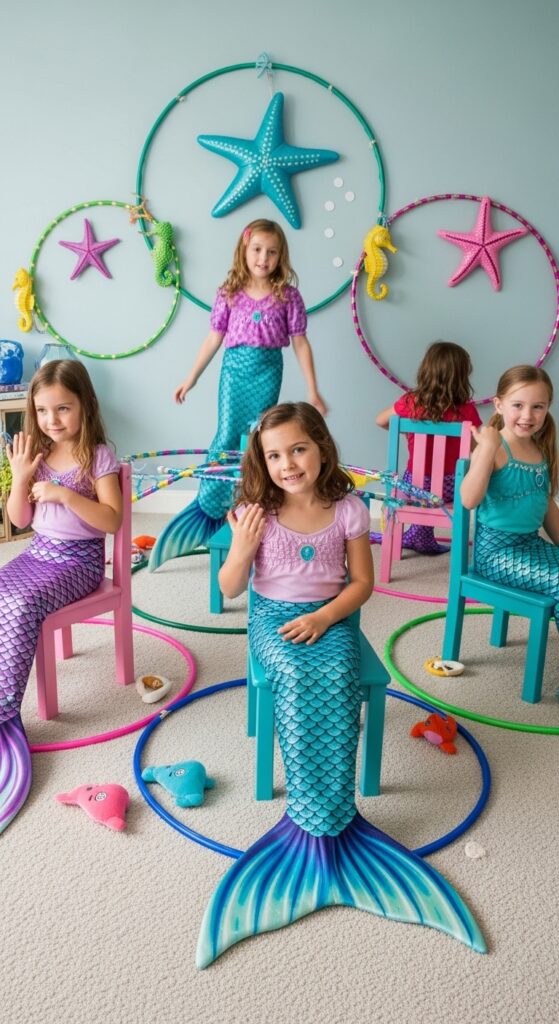 This mermaid musical chairs combines the best of freeze dance with classic elimination gameplay. Instead of chairs, kids swim around colorful “coral reefs” (hula hoops work perfectly). When the ocean soundtrack stops, they must freeze like sea creatures inside their nearest reef.