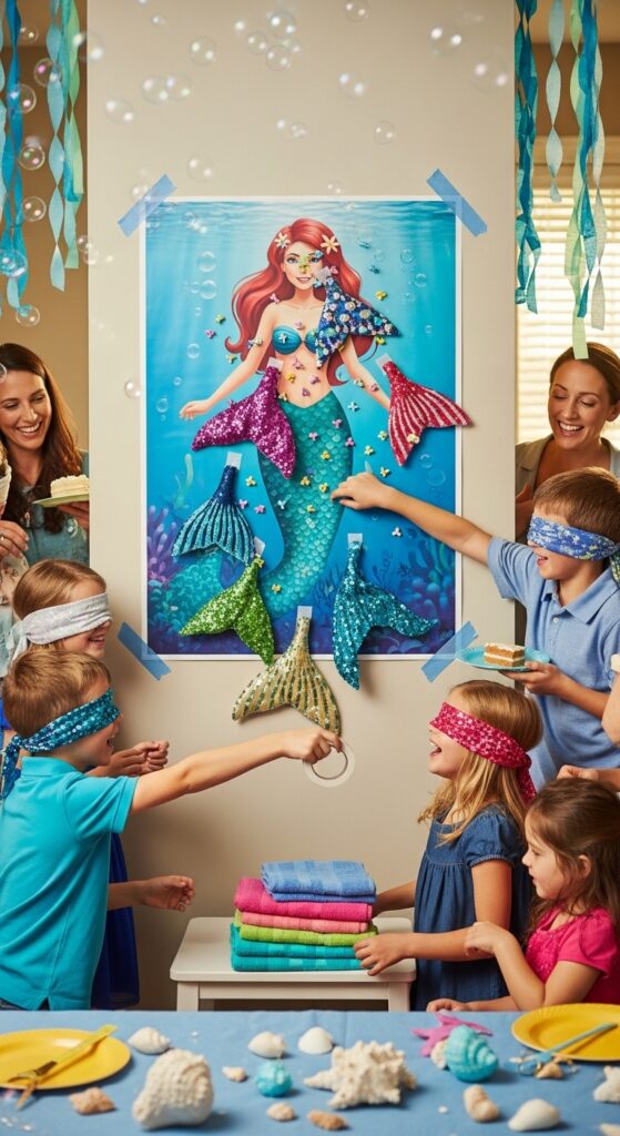 You’ll need a large poster of a tailless mermaid and colorful fabric tails with double-sided tape. The key lies in proper tail location placement—mark a clear target zone so kids don’t end up pinning tails to the mermaid’s face!