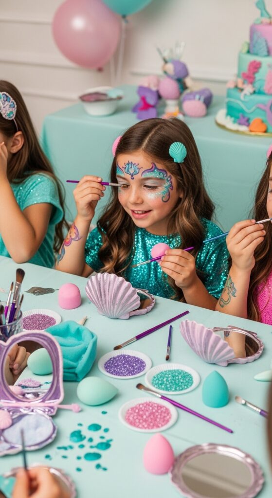 Three essential stations will convert your party guests into authentic mermaids, and I’ve learned that setup makes all the difference. Start with glitter makeup application using washable face paints in ocean blues and greens. I recommend having makeup sponges and fine brushes ready for detailed scale patterns.