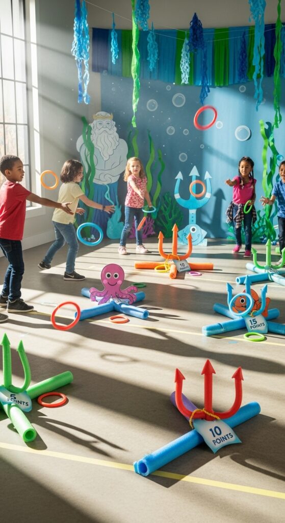 Create tridents using pool noodles or cardboard, then set up targets at varying distances. I recommend coordinating ring colors with different point values—blue rings worth five points, green worth ten.