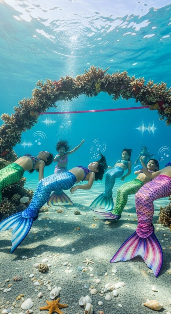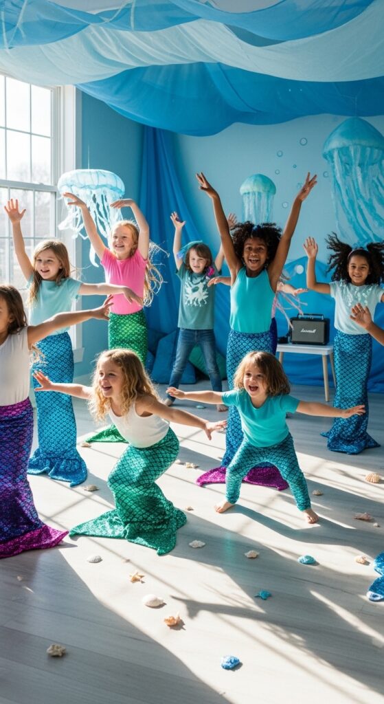 For older kids, organize synchronized swimming demonstrations on dry land. They’ll love creating graceful arm movements and “diving” poses. Add competitive elements like fastest tail-wiggle contests or who can hold a mermaid pose longest. These activities burn energy while keeping the underwater theme alive.