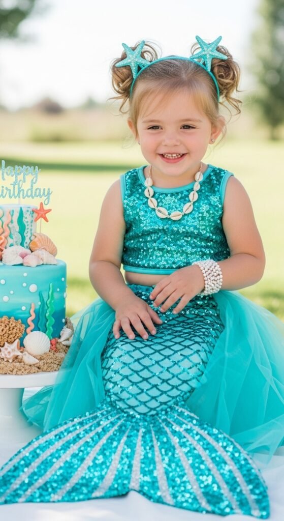 This same styling approach works wonderfully for 1st birthday parties, creating an age-appropriate mermaid look that’s both comfortable and photo-ready.