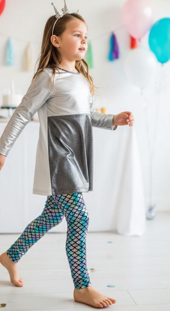 This combo works perfectly for active party games since leggings won’t restrict movement. Plus, you’ll stay comfortable throughout the entire celebration while looking absolutely magical.