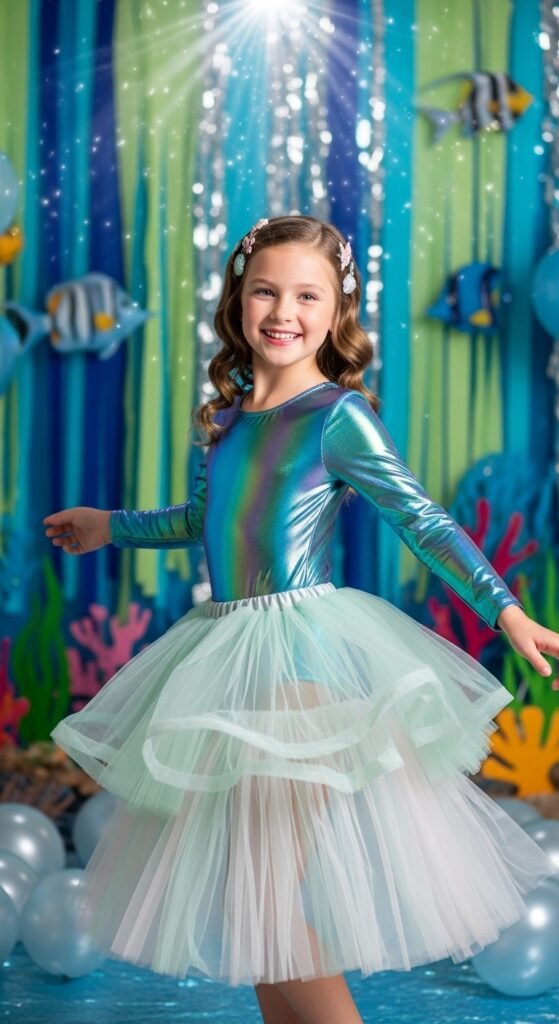 Don’t forget sparkly accessories like shell necklaces or pearl bracelets to complete the look. Coordinating hair pieces such as starfish clips or seaweed-colored ribbons tie everything together seamlessly, creating an enchanting underwater princess appearance.