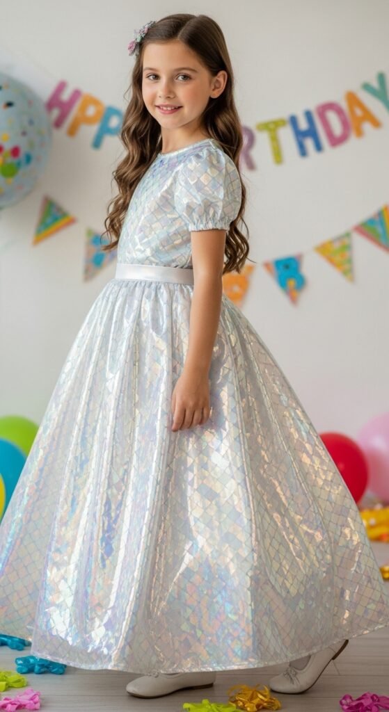Shimmering rainbow scales meet practical party wear in this stunning two-piece combination that metamorphoses any birthday girl into an ocean goddess. You’ll love how the holographic skirt catches light from every angle, creating that authentic underwater magic we’re all chasing.