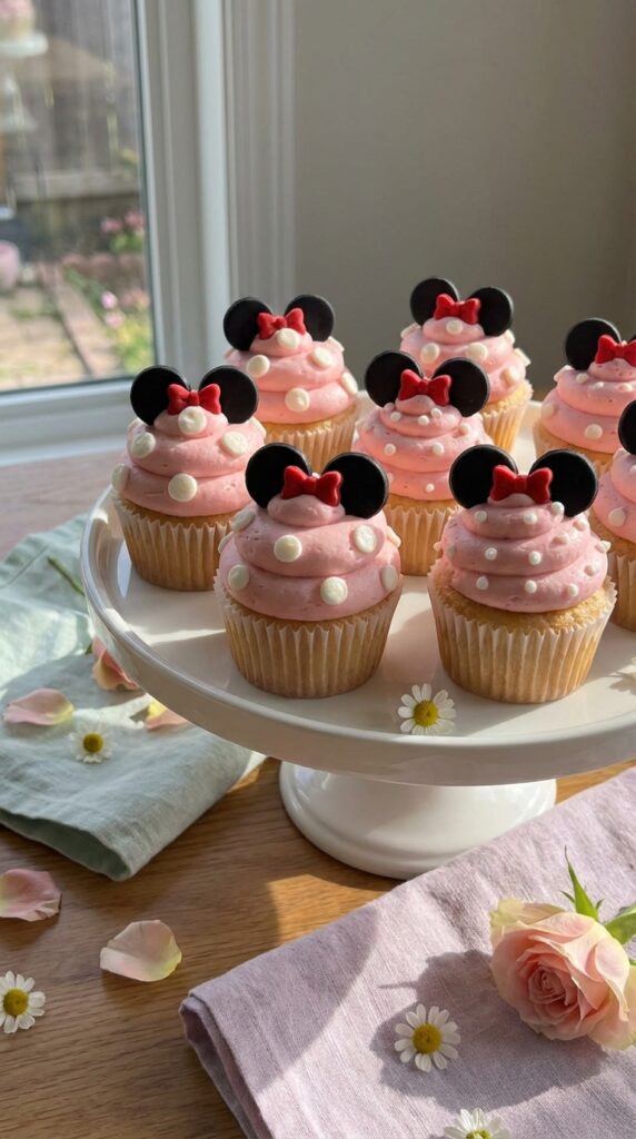Nothing kicks off a Minnie Mouse party quite like cupcakes topped with her signature polka dots. You’ll want to command a few decorative icing techniques to nail this classic look. I’ve found that using a round piping tip creates perfectly uniform dots, though you can also dab them on with a toothpick for a more fanciful effect.