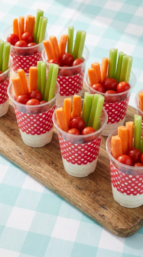 Veggie cups are your answer—they’re practical, adorable, and surprisingly easy to assemble. Simply fill clear plastic cups with ranch dip at the bottom, then add carrot sticks, celery, and cherry tomatoes. The magic happens when you wrap each cup with polka dot wrappers in Minnie’s signature red, white, and pink colors.
