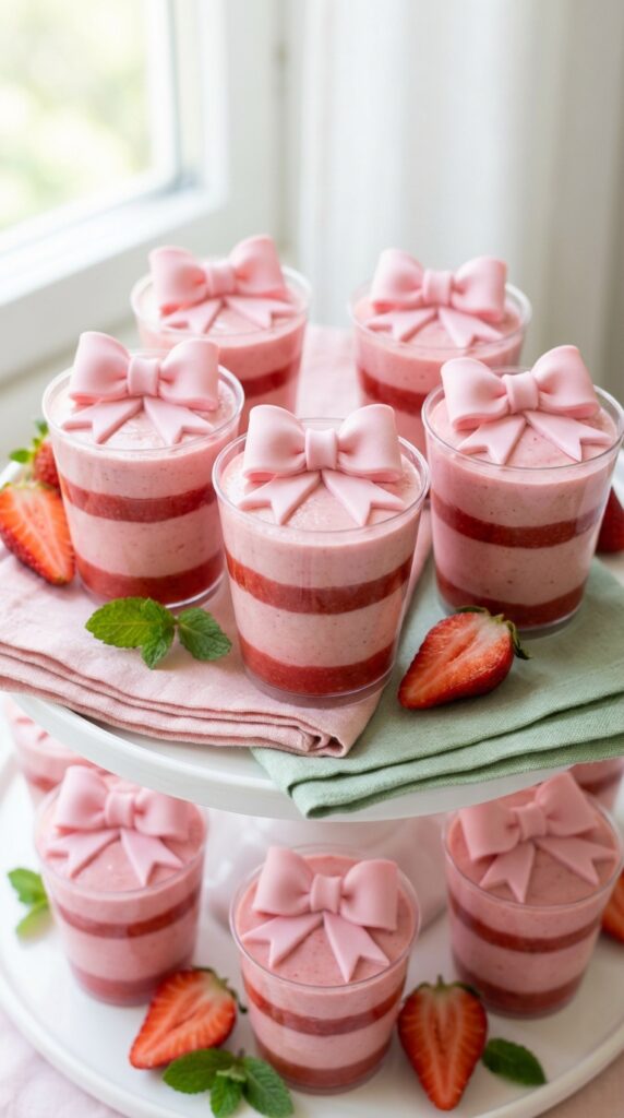 These strawberry mousse cups deliver that perfect creamy texture everyone loves, and the chilled presentation keeps them fresh throughout your party. I make mine in clear plastic cups so you can see those gorgeous pink layers.