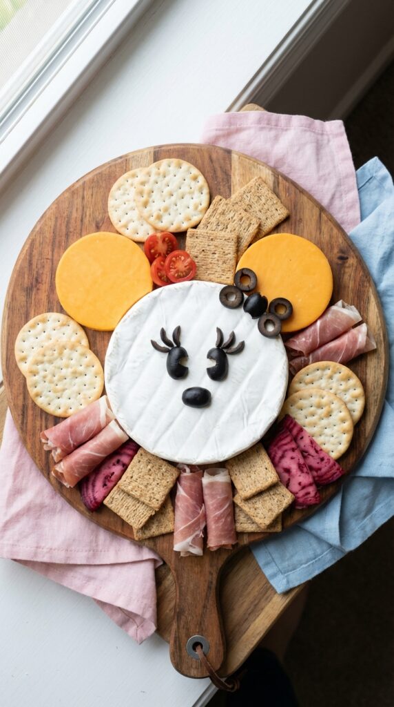 Arrange a large round cheese wheel as Minnie’s face, then add two smaller rounds above for her iconic ears. Fill spaces with crackers, cherry tomatoes, and olives.