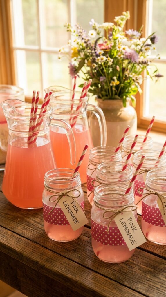 Why serve plain water when pink lemonade instantly alters your beverage station into a Minnie-worthy focal point? You’ll want classic strawberry or raspberry versions, though I’ve found watermelon creates the perfect blush shade. The real magic happens with striped paper straw styles—red and white patterns echo Minnie’s iconic look beautifully.