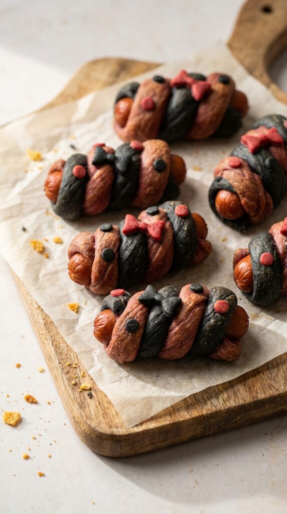 Mini Hot Dogs Wrapped in Black and Red Pastry