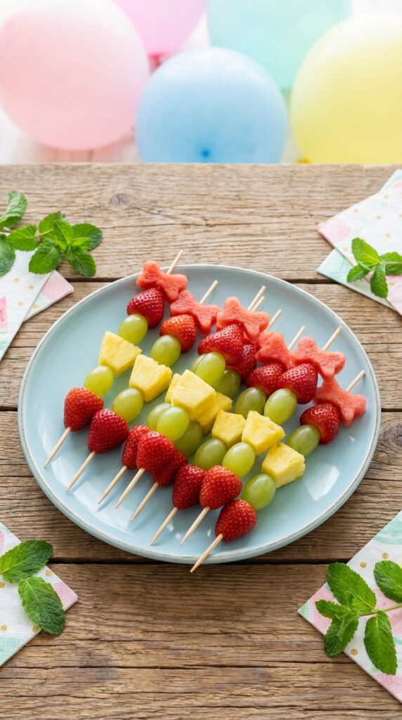 Thread strawberries, grapes, and pineapple chunks onto wooden skewers, then crown each one with a watermelon bow cutout. You’ll need a small bow-shaped cookie cutter to punch these from watermelon slices—trust me, it’s worth the investment.
