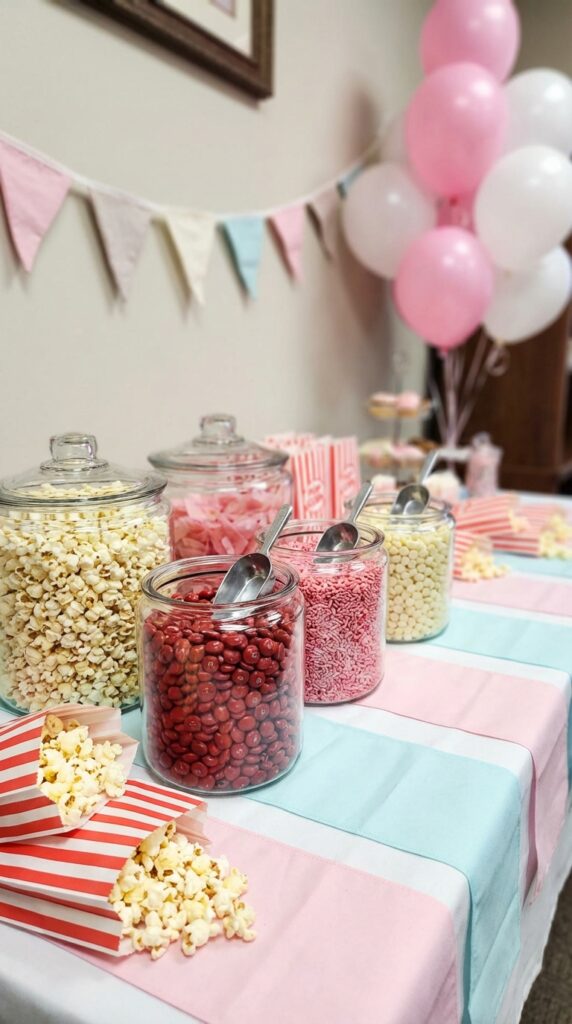 A popcorn bar is hands-down one of the easiest party setups that’ll keep kids (and adults) coming back for more. Set out fresh popcorn in striped bags or classic red containers, then arrange your flavored popcorn toppings in small bowls.