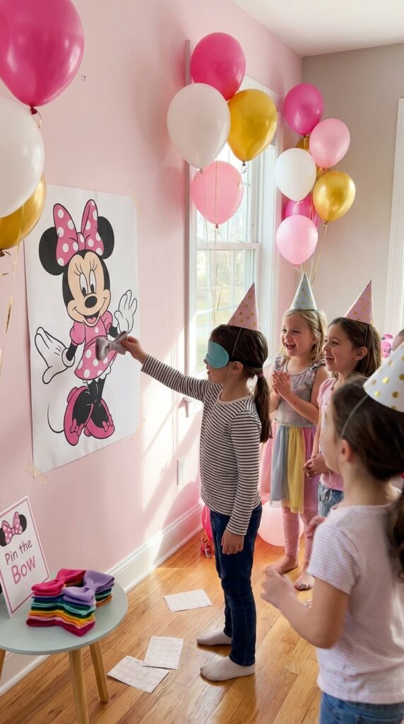 I’ve found that printing a large poster of Minnie works perfectly. Blindfold each child, spin them around three times, and let them attempt to place the bow where it belongs.