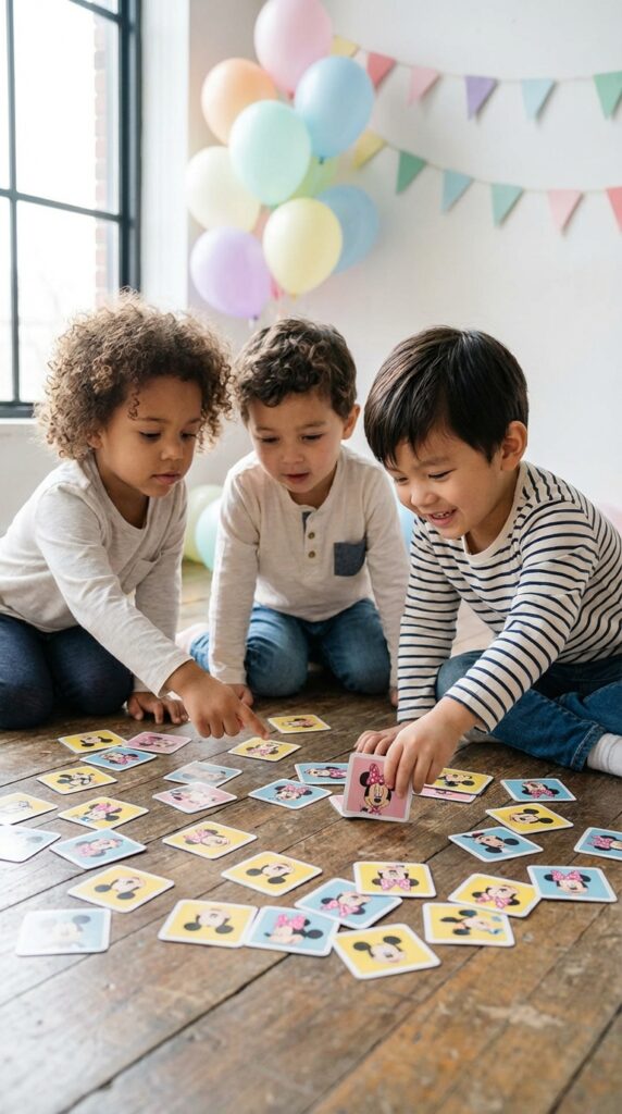 Memory matching games work beautifully at Minnie Mouse parties because they’re naturally inclusive—younger kids can play alongside older ones, and you don’t need much space to set it up.