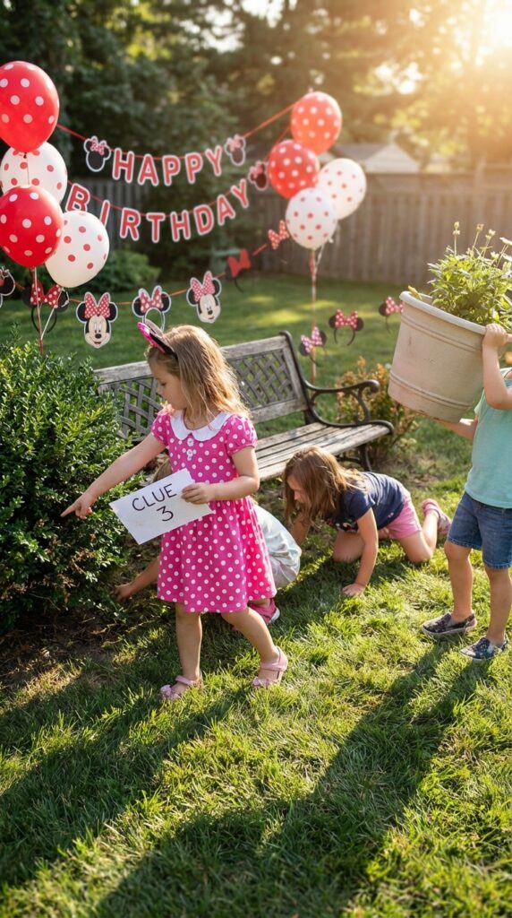 A Minnie Mouse scavenger hunt metamorphoses your party space into an expedition zone that keeps kids moving and problem-solving for a solid 20-30 minutes.