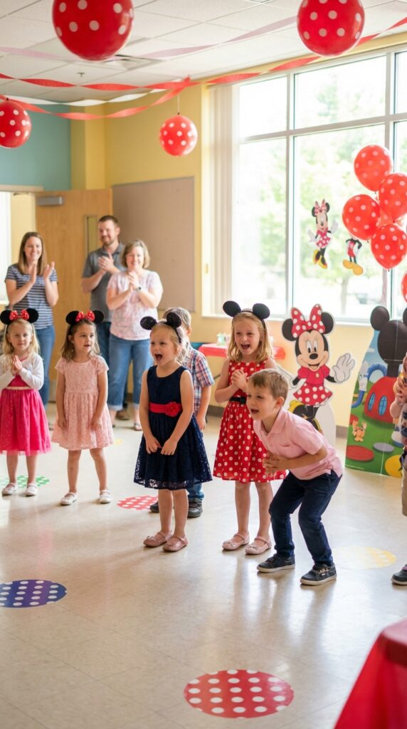When the music plays, kids dance around using rhythmic motions like Minnie herself—twirling, hopping, or doing the twist. Once the music stops, everyone finds a polka dot to stand on (no shoving required!). The interactive gameplay keeps all children engaged since nobody’s eliminated.