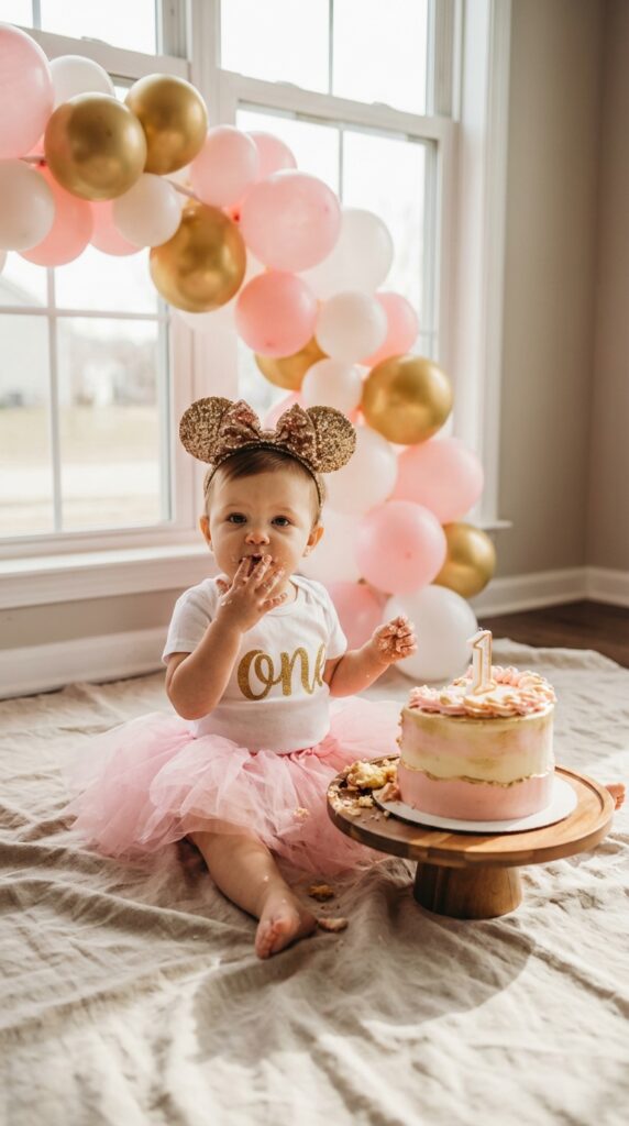 When it comes to first birthday photos that’ll make your Instagram followers swoon, nothing beats the pink and gold Minnie Mouse theme. This sophisticated color combo enhances the classic look while keeping that adorable Disney magic intact.