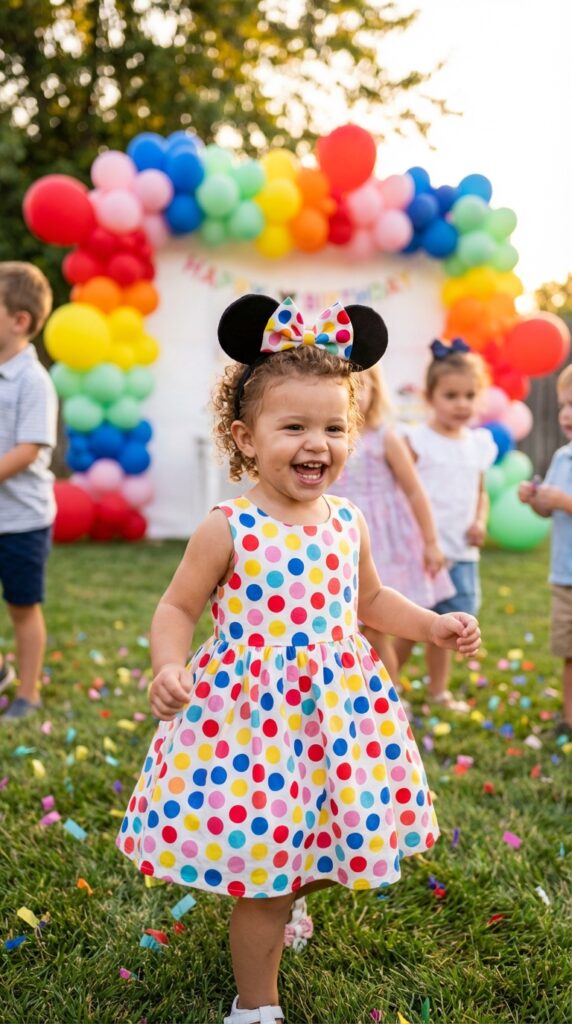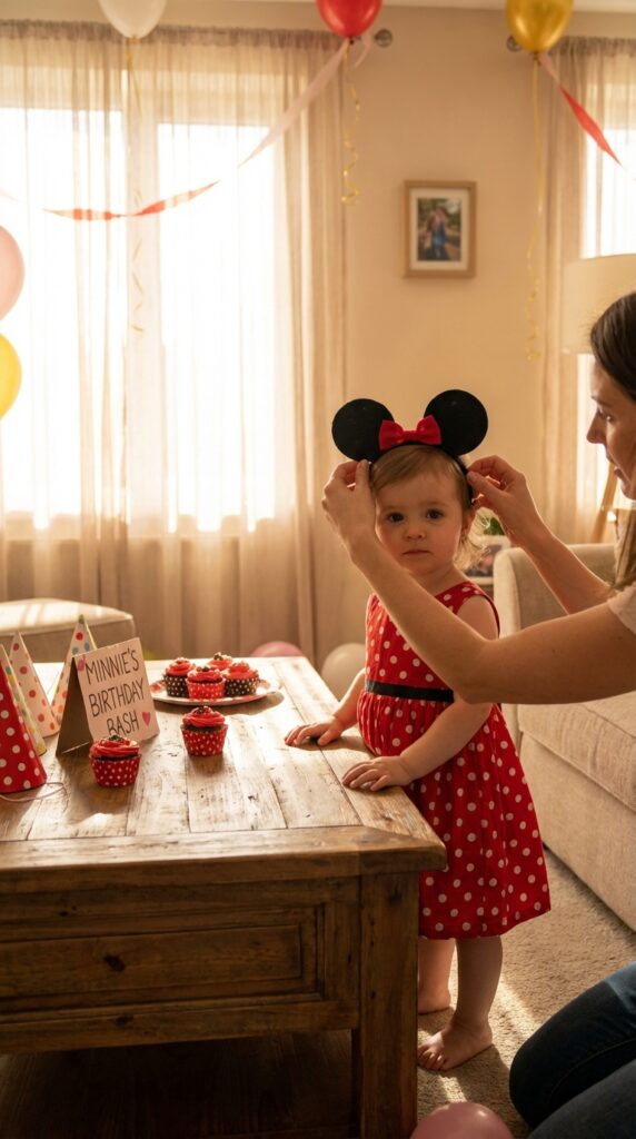 You’ll love headbands with bows as the perfect Minnie-inspired accessory! Polka dot hair clips also work beautifully to complete the look. They’re easy to wear and instantly add that classic Minnie Mouse charm to any birthday outfit.