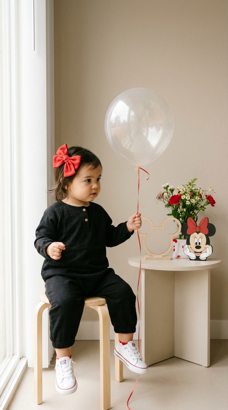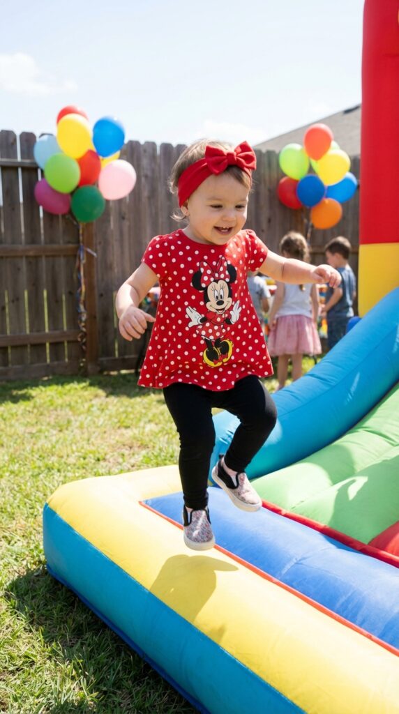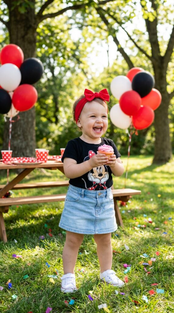 Complete the look with personalized accessories like a bow headband with your child’s name. Add mouse themed footwear—think slip-on sneakers with ear details—for practical comfort that’ll last through cake cutting and beyond.