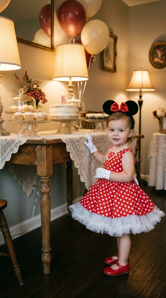 This vintage outfit pairs beautifully with birthday party themes that embrace classic Disney nostalgia and timeless celebration styles.