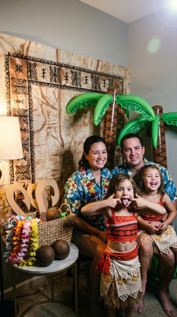 After the games wind down, a Moana photo booth corner gives kids (and parents) a fun reason to pause and capture the magic. Set up tropical photo booth backdrops featuring palm trees, ocean waves, and island scenery to instantly convert any wall into a mini Hawaiian escape.