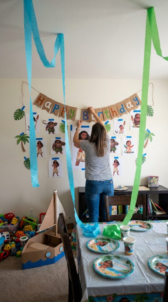 You can also create custom Moana decorations like mini ocean scenes inside glass jars, which double as keepsakes. Pre-cut the supplies beforehand so kids aren’t waiting around. Trust me, four-year-olds have zero patience for prep work!