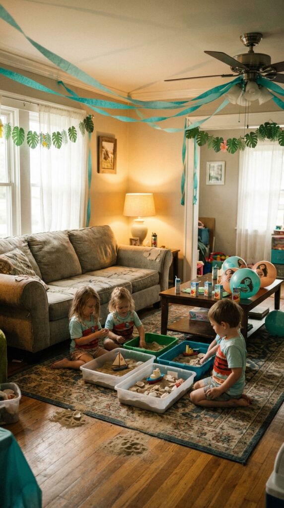 Set up cozy indoor activities like Moana-themed storytelling corners, DIY lei-making stations, and ocean sensory bins filled with kinetic sand and seashells. Kids absolutely love these hands-on experiences.