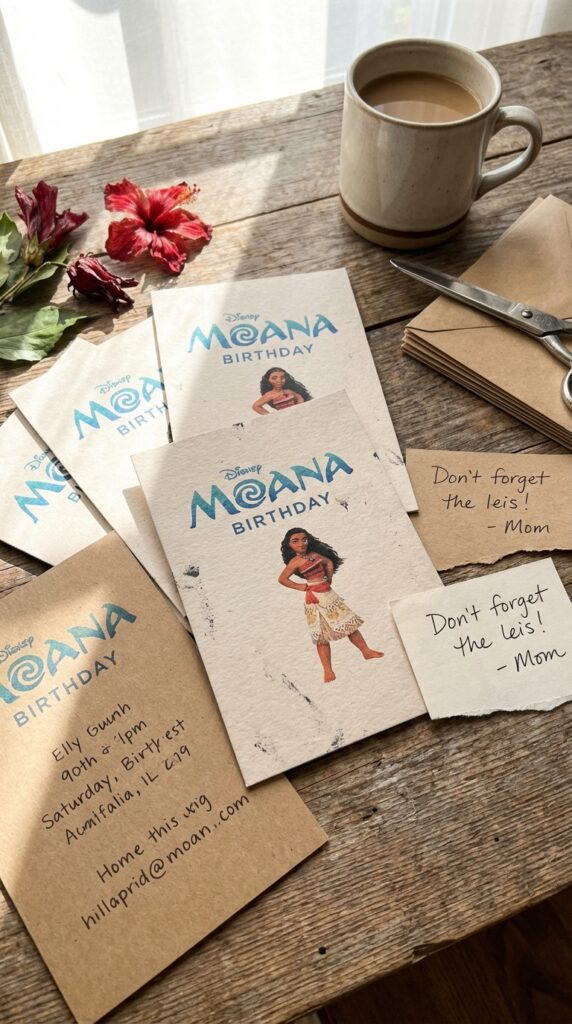 Every great party starts with an invitation that gets kids excited before they even arrive. Custom Moana invitations set the perfect tone, featuring ocean waves, tropical flowers, and your little one’s favorite characters.