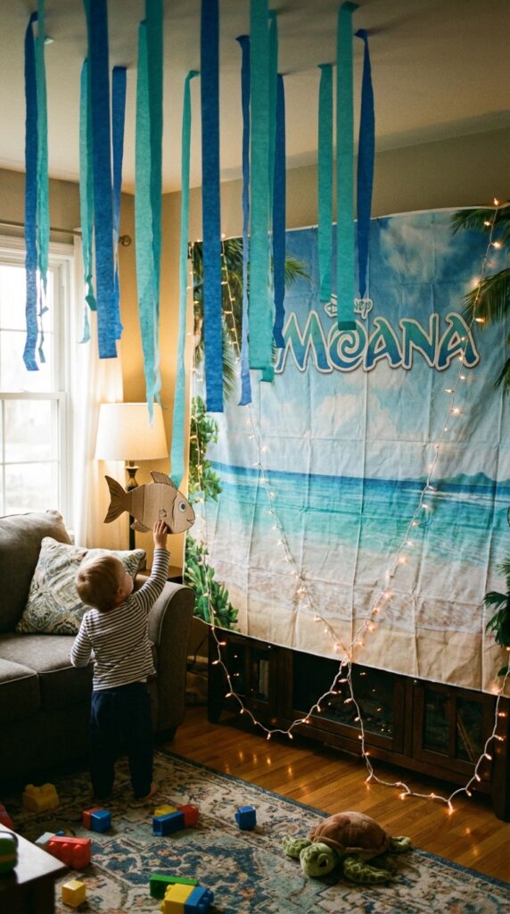 Once you’ve sent out those invitations, it’s time to convert your party space into Motunui itself. Start with ocean backdrops featuring waves, tropical flowers, and glowing sunsets — they’re instant mood-setters. Hang blue and teal streamers from the ceiling to mimic flowing water.