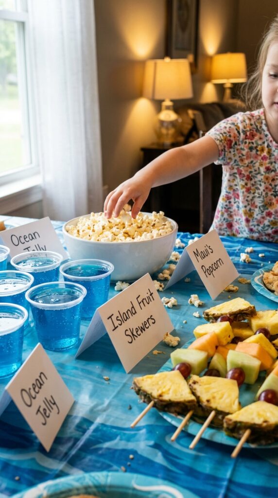 Label everything with character names like “Tamatoa’s Treasure Trail Mix” or “Maui’s Magical Fish Crackers.” Kids absolutely love themed food names! For a more complete spread, consider serving tropical Moana-themed dishes like grilled teriyaki skewers or coconut rice to give the celebration an authentic Polynesian feel.