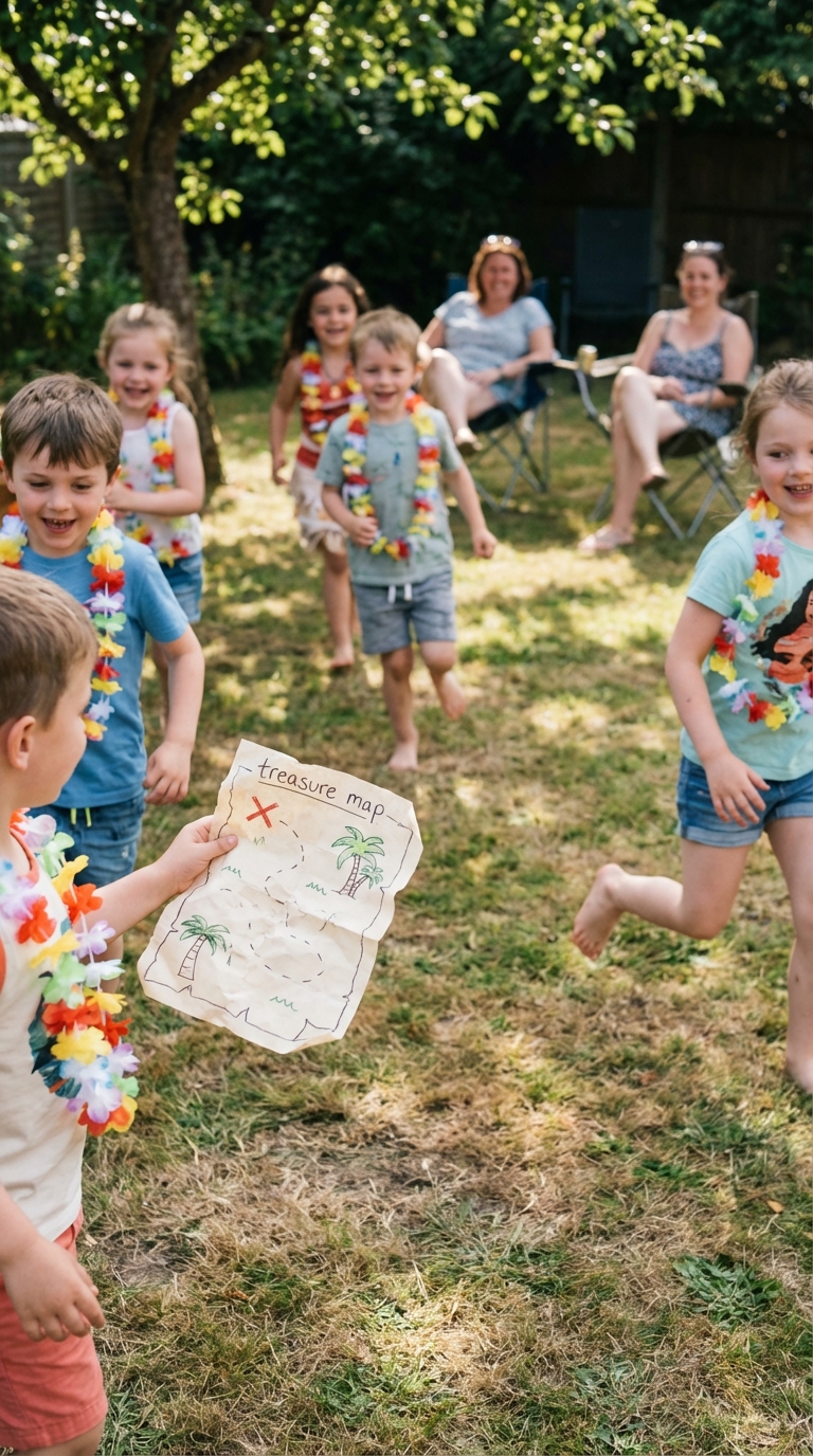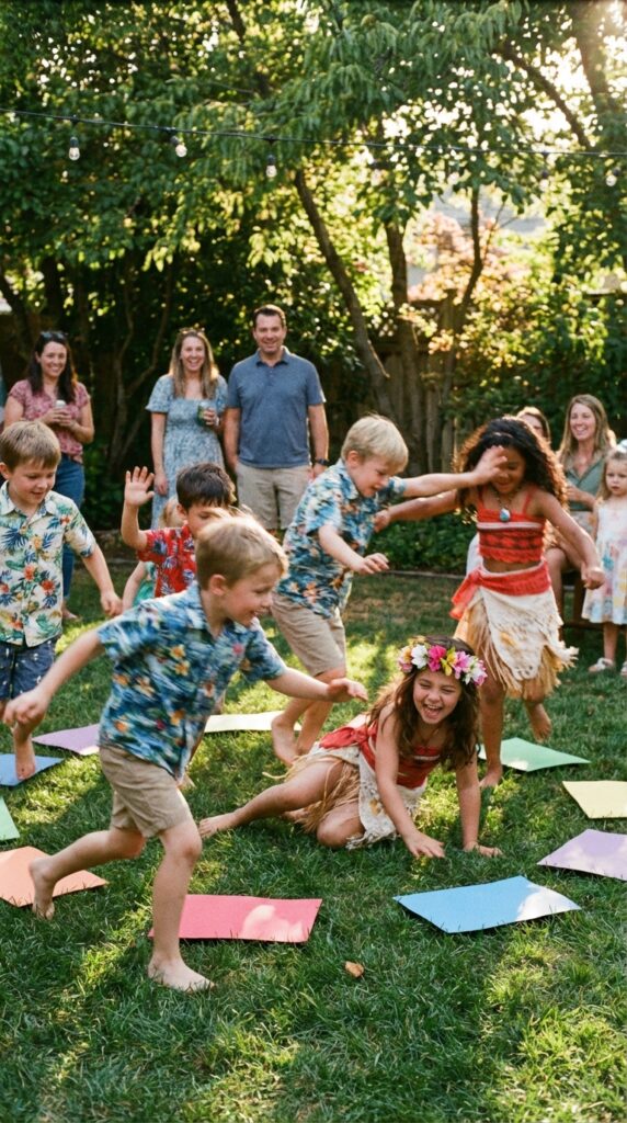 Try “Catch the Ocean Wave,” where kids pass a blue ribbon while music plays. Add physical activities like a coconut toss or “Row Your Canoe” relay race to burn that birthday energy.
