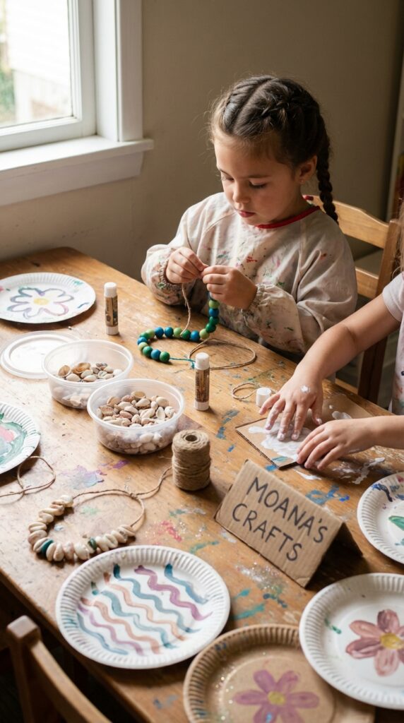 Once the activities wrap up, keep the creative energy going with DIY crafts that kids can take home as party favors. Set up a craft station where little ones decorate their own shell necklaces or paint mini canoes — both make adorable personalized Moana favors.
