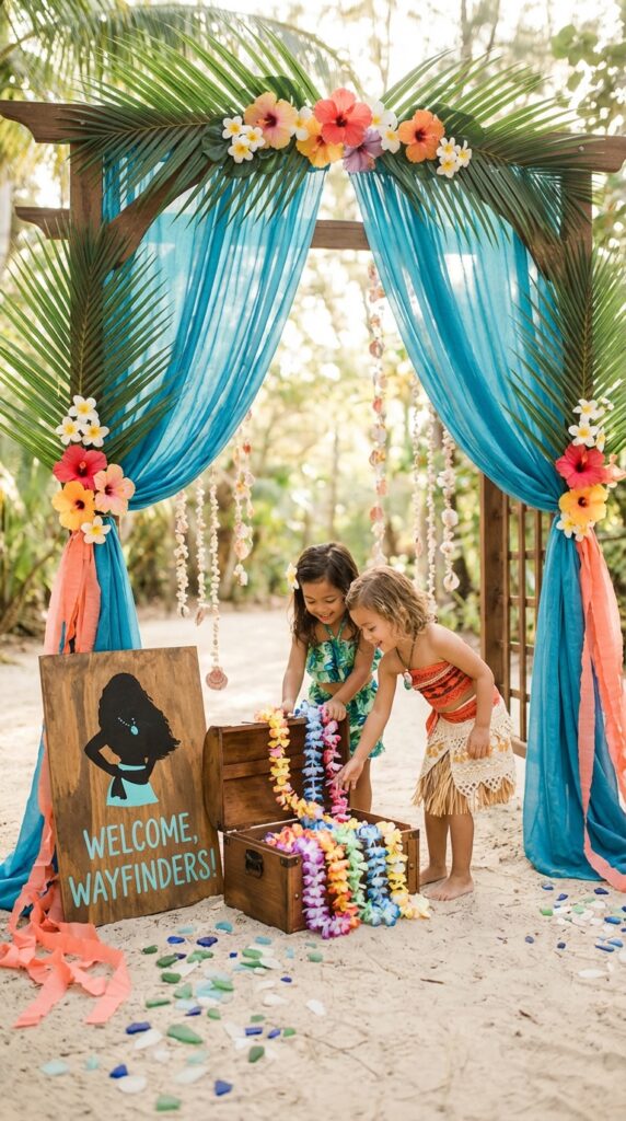Add an interactive welcome sign featuring Moana’s silhouette where kids can write their names or leave messages. Hang shell garlands and place a small treasure chest filled with lei necklaces nearby. Guests can grab a lei as they enter, immediately feeling like they’ve arrived on Motunui.