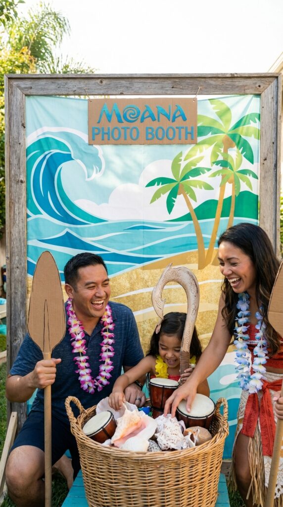 Add themed photo frames printed with hibiscus flowers and ocean motifs for instant charm. Stock a prop basket with cardboard oars, flower leis, seashells, and fish hooks. Kids absolutely love grabbing silly props for snapshots.