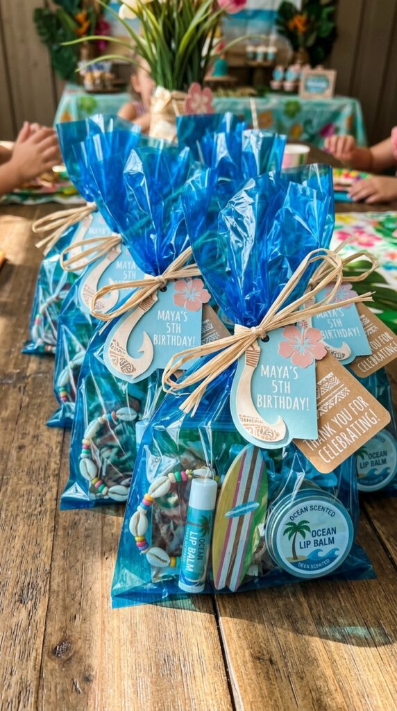 Every guest deserves to leave with a little piece of the ocean, so pack favor bags that keep the Moana magic going long after the party ends. Fill them with tropical-themed goodies like shell bracelets, mini surfboards, and ocean-scented lip balms.
