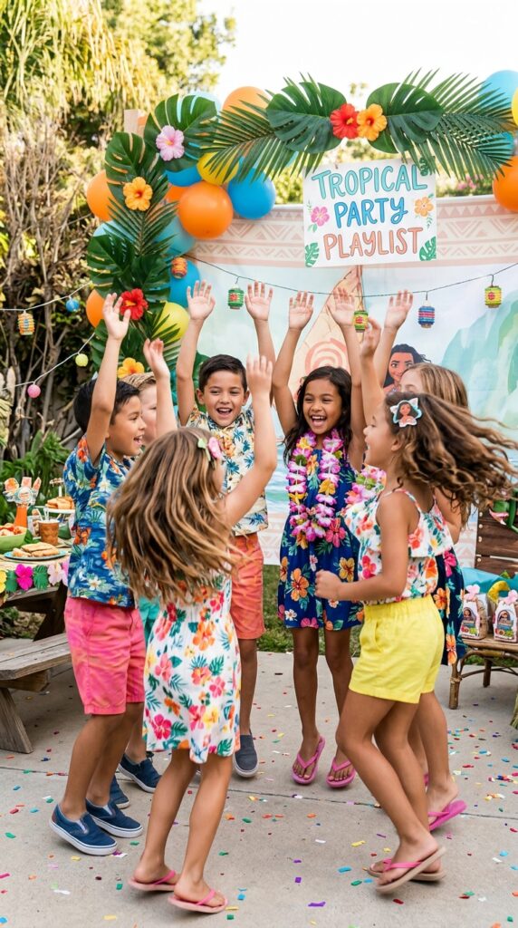 You’ll want to build an energetic dance playlist that mixes Moana songs with kid-friendly tropical beats to maintain momentum between activities. Add classics like “Under the Sea” for extra Disney magic.