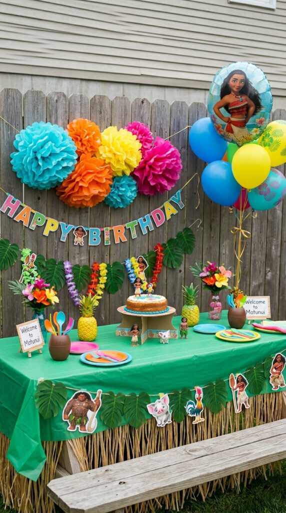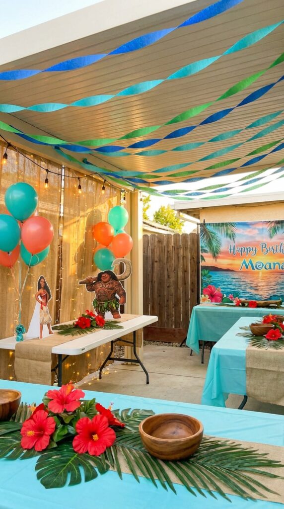 Teal and coral balloon clusters work beautifully against any wall. Add a few Moana character cutouts near the food table for that extra wow factor. String up some warm fairy lights to create a glowing sunset feel.