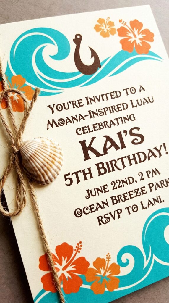 Before your guests even arrive, the invitation sets the tone for the whole celebration. Create tropical themed invitations featuring ocean waves, hibiscus flowers, and Moana’s iconic hook symbol. You can design customized Moana invitations using Canva or Etsy templates, adding your child’s name and party details effortlessly.