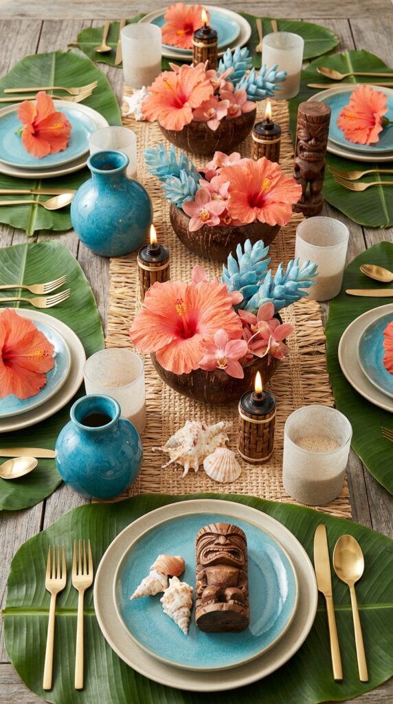 Layer refined leaf place settings using real or faux banana leaves as placemats — they’re captivating and affordable. Add a seashell beside each plate for extra island charm. Keep colors in ocean blue, coral, and gold to tie everything beautifully together. For an extra touch of authenticity, incorporate Polynesian-inspired décor elements like woven textures and carved wooden accents to bring the spirit of the islands to life.