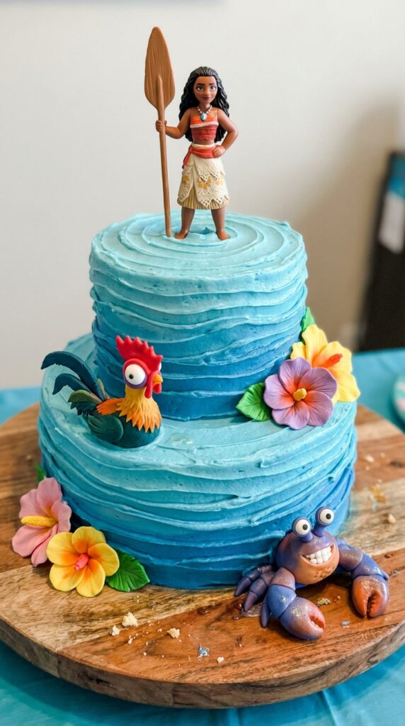 Every great birthday party deserves a showstopping cake, and a Moana-themed one is honestly one of the most fun to pull off. Order a custom design featuring ocean waves, tropical flowers, and decorative fondant accents shaped like Hei Hei or Tamatoa’s shell. You’ll want to request custom cake toppers featuring Moana herself holding her oar — bakeries can create these beautifully. From tiered ocean wave designs to tropical flower arrangements, Moana cake designs offer a wide range of creative styles to suit any skill level or budget. If you’re baking at home, store-bought fondant works surprisingly well for ocean-themed details. Blue ombre buttercream mimics rolling waves effortlessly. Either way, your five-year-old’s face when she sees it will absolutely make every penny worth spending.