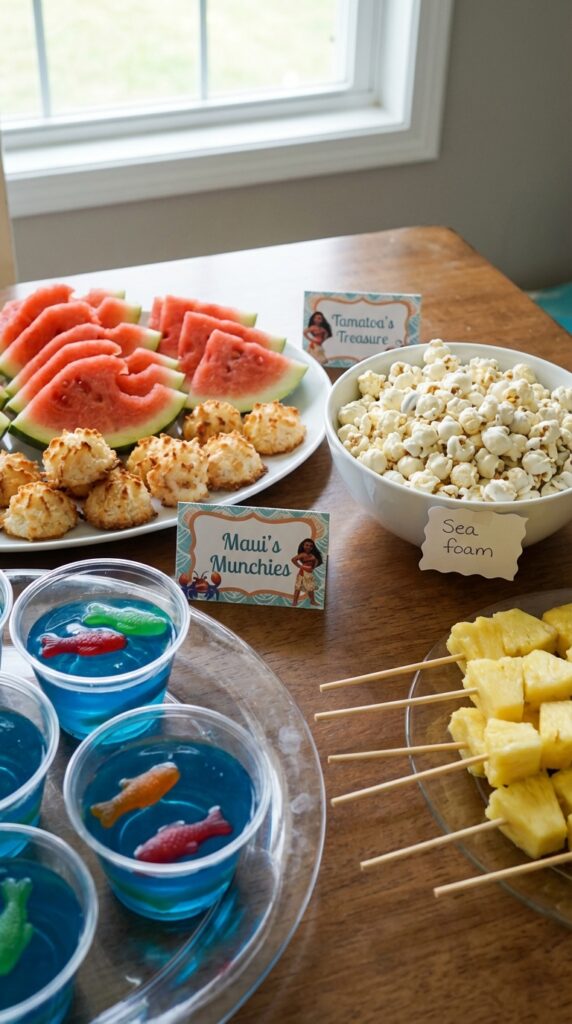 Label everything with Moana-themed tags — “Maui’s Munchies” or “Tamatoa’s Treasure” — and suddenly ordinary snacks become part of the story.