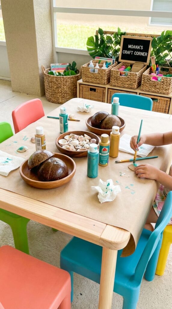 For shell painting ideas, provide flat clamshells and metallic gold and teal paint. These double as keepsakes parents won’t immediately toss. Win-win. These age-appropriate Moana activities work beautifully for younger siblings in attendance too, so no one feels left out at the craft table.