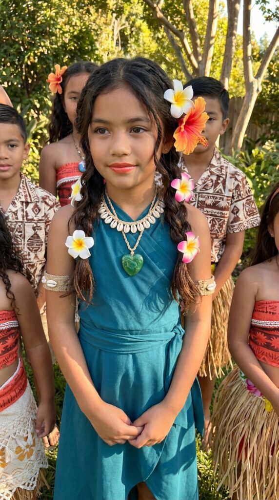 Once those crafts are drying, it’s time to talk costumes — because no Moana party hits quite right if the birthday girl isn’t dressed the part. Grab an authentic-looking teal wrap dress, then layer on moana inspired accessories like shell necklaces, arm cuffs, and her iconic heart of Te Fiti pendant.