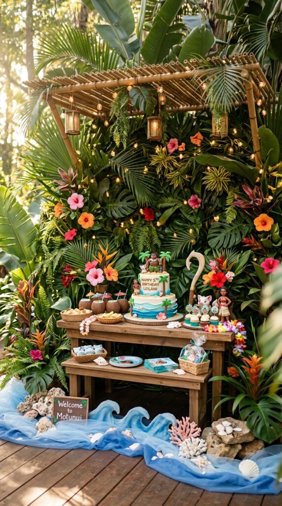 Next, build canopy structures overhead using bamboo poles and draped greenery. This creates that signature island depth that instantly transports guests into Moana’s world. String fairy lights through the leaves for magical evening ambiance. Enhance the overall scene by incorporating ocean-inspired accents like shells, coral pieces, and blue fabric waves to complement the jungle greenery.