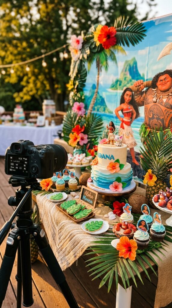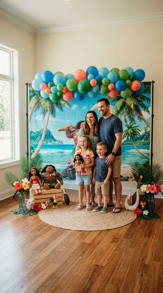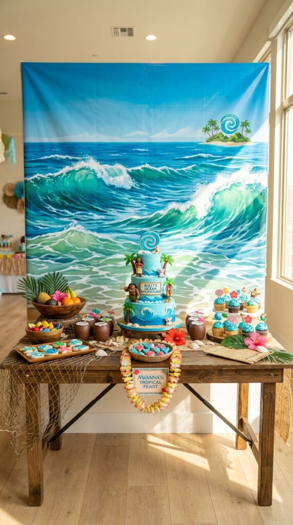 Position your ocean backdrop behind the dessert table for maximum impact. When guests walk in, that wall of rolling waves immediately transports everyone to the South Pacific. Trust me, it’s the first thing people photograph. Pair it with Moana-inspired cake designs on your dessert table to create a cohesive ocean theme that looks absolutely breathtaking in photos.