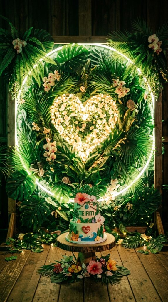 Few backdrops stop guests in their tracks quite like a glowing Te Fiti heart design. You can recreate that iconic emerald heart using LED fairy lights arranged in a teardrop shape against a lush tropical green backdrop.